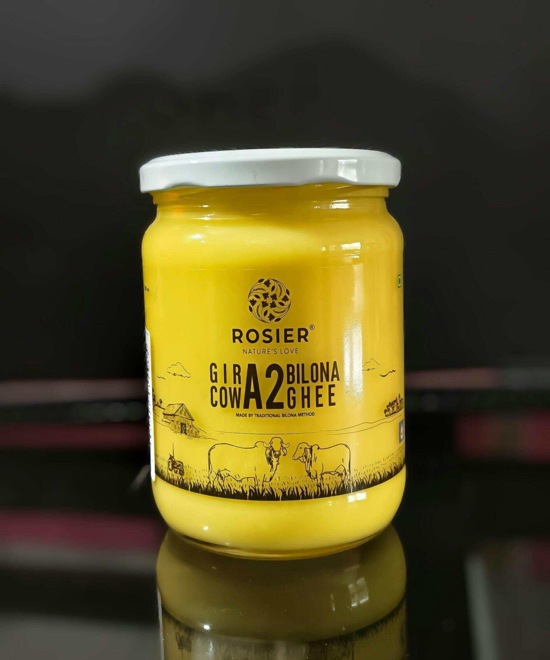 A2 Gir Cow Ghee is made using fresh Gir cow milk. The Cows are free-grazed. The milk from them is brought to a boil and naturally cooled down to room temperature and inoculated with a natural starter culture and left overnight to make curd. The curd is churned using the traditional 'Bilona method'